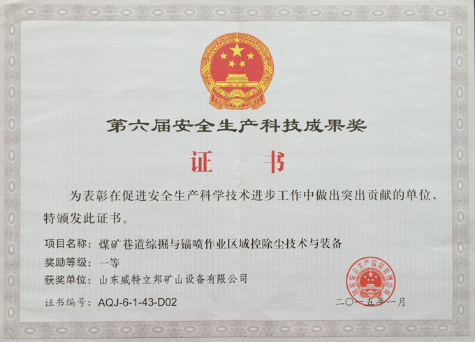 • 濟寧市首屆創新大賽“煤礦采掘面濕噴除塵系統設備”創新組二等獎